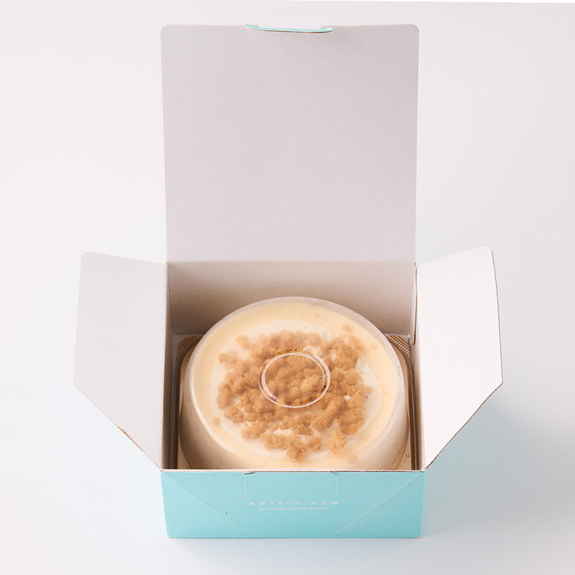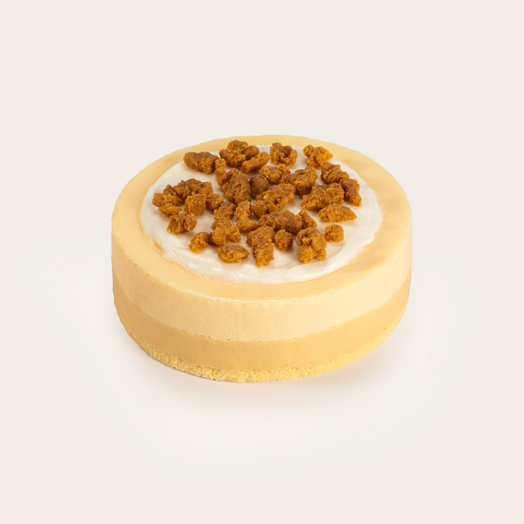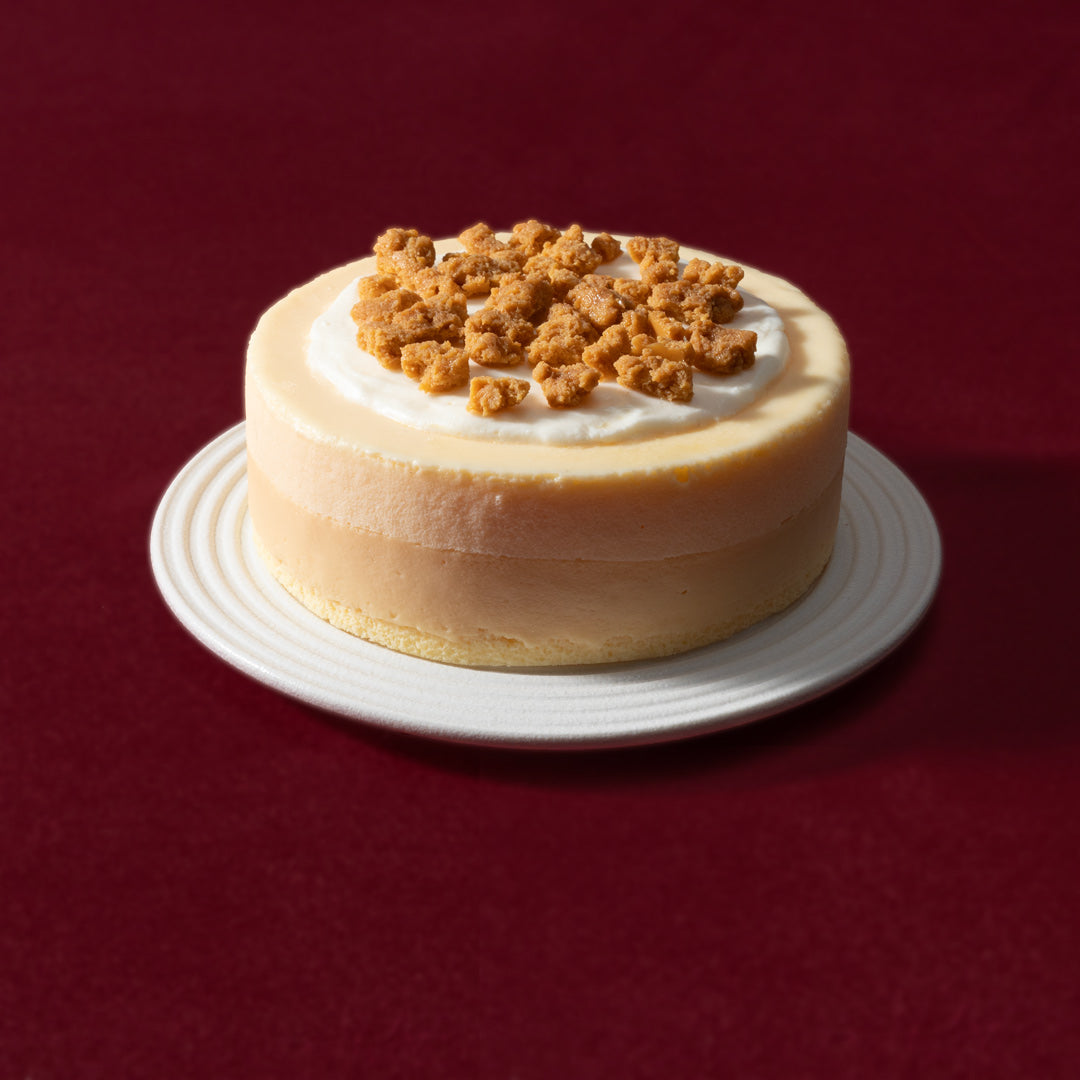 The cake is finished with a touch of fresh cream and a light sprinkling of cinnamon scented streusel, adding texture and a soft aroma that complements the creamy layers. Every element comes together to create an indulgent experience that celebrates the depth and character of fine cheeses.